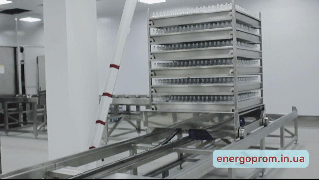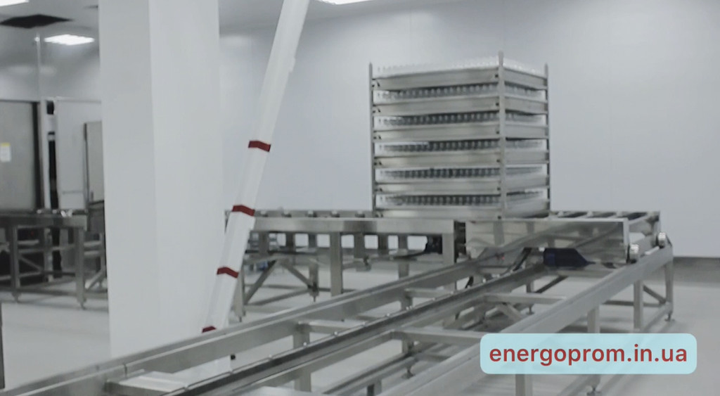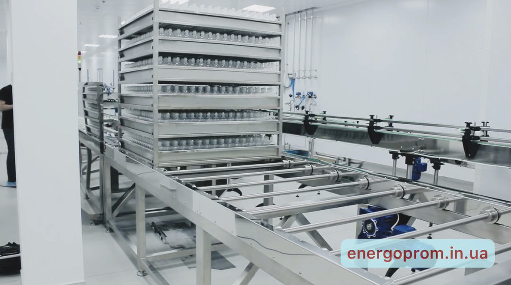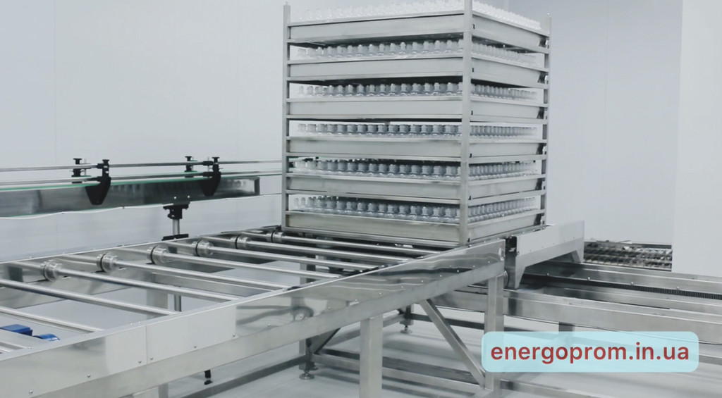 Рольганги та каретки транспортування касет з флаконами є складовою лінії транспортування та стерилізації інфузійних флаконів продуктивністю 8500 фл/год